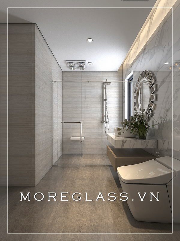 Thiết kế và thi công vách tắm kính cường lực cửa trượt hiện đại tiết kiệm không gian.