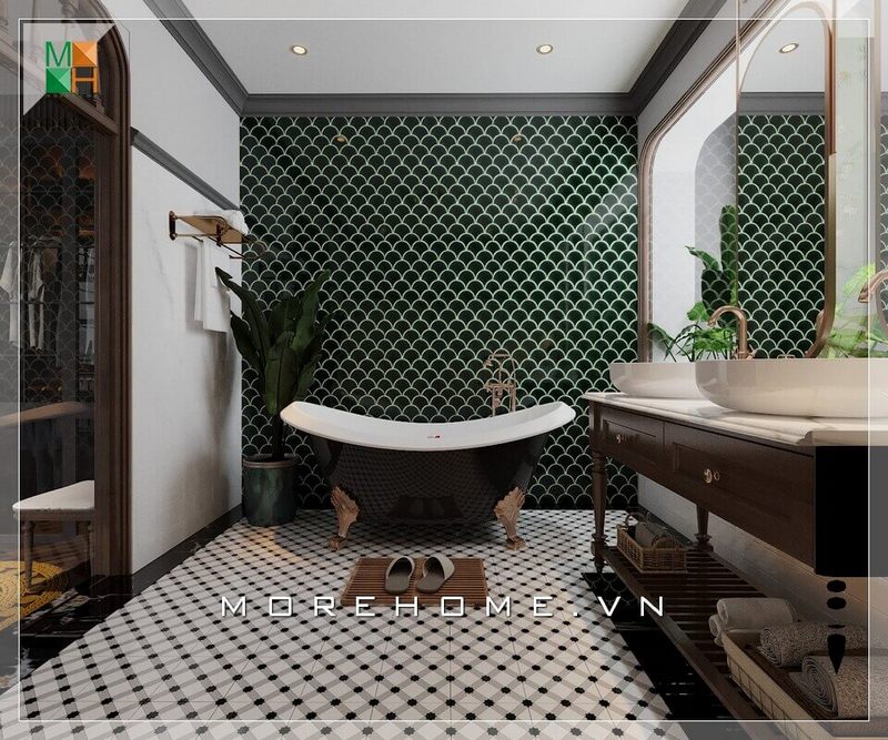 Mẫu thiết kế nội thất phòng tắm với gạch vảy cá màu xanh ấn tượng rất tiện nghi và bố trí độc lạ phù hợp cho không gian nhà phố, biệt thự, nhà phố.