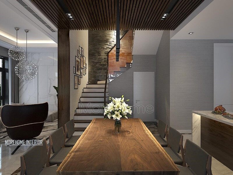 Phòng ăn hiện đại được thiết kế khá độc đáo với ý tưởng lồng ghép vào phòng bếp vừa tạo sự tiện nghi vừa đẹp,s ang trọng.