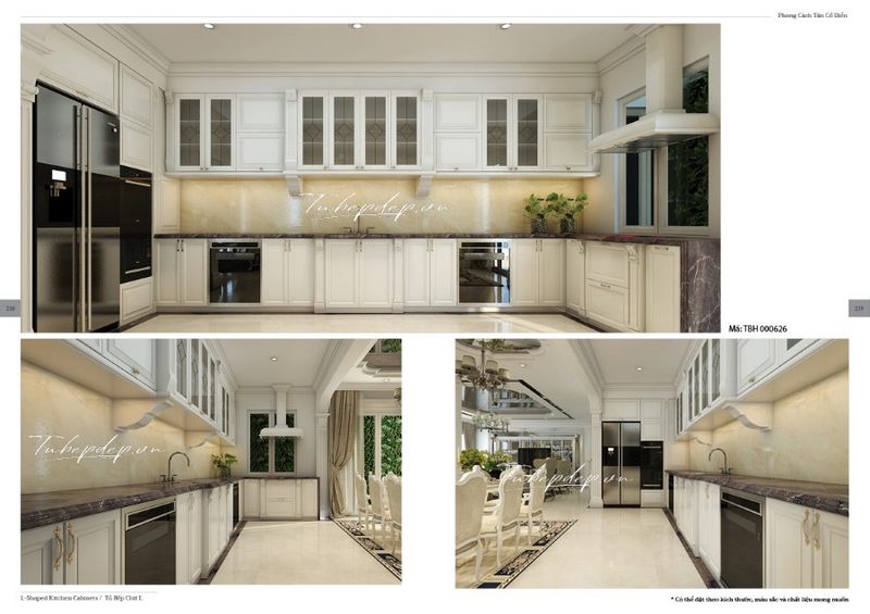 Mẫu tủ bếp tân cổ điển mang lại sự trẻ trung và hoàng gia cho căn bếp của biệt thự, nhà phố, giúp nó trở nên cao cấp và rộng rãi hơn với màu trắng.